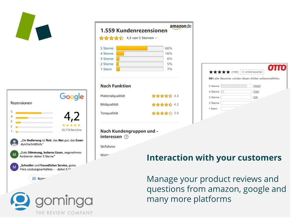 gominga thus enables the management and analysis of reviews and questions from over 300 online platforms in one application. gominga enables businesses to efficiently and easily respond to customer reviews, turning prospects into repeat customers.