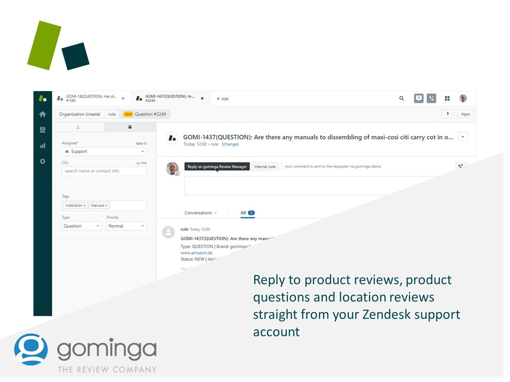 To enable Zendesk users to easily manage their reviews and queries from Amazon, Google & Co. via your Zendesk interface, we have developed a specific Zendesk app, the gominga Review Manager, which is available here and in the official Zendesk Marketplace.