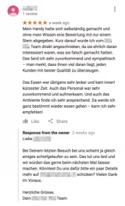 Also, in this case, the guest updated the review: he was excited to receive a response to his criticism and gave one star more. This example shows that a professionally written management response can turn bad experiences into good ones. The guest’s impression of the restaurant changed and he even would like to come back.